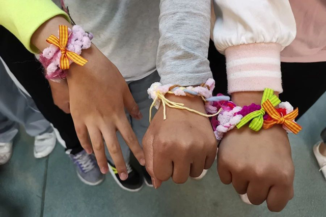 志愿者將女紅傳習館紙板織課程進行簡化,讓參與活動的孩子們都能通過簡單的材料做出一件手環(huán)作品,而志愿者準備的小飾物更是“錦上添花”。