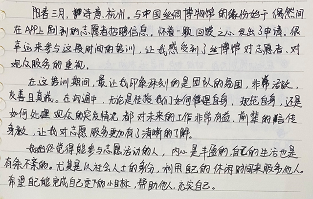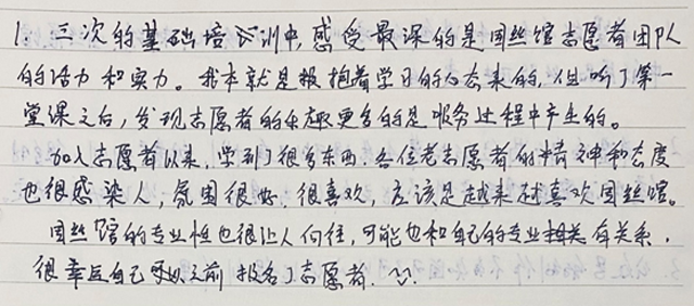 從4月10日到5月15日,志愿者共完成了志愿者服務(wù)理念、國絲概況與各項業(yè)務(wù)概要、志愿者工作溝通技巧、國絲志愿者章程四項理論學(xué)習,還認真接受了禮儀接待實訓(xùn),并邀請優(yōu)秀志愿者同行來館分享志愿服務(wù)心得體會和服務(wù)經(jīng)驗等。國絲老志愿者也和大家交流了自己在國絲服務(wù)、學(xué)習的收獲。