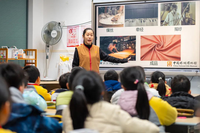 李子微在家里是兩個孩子的媽媽,在國絲,她是手工、講解、攝影都拿得出手的全能志愿者。她作為“志愿者絲路文化進(jìn)校園/進(jìn)社區(qū)”的骨干,在社教部指導(dǎo)下,制作了桑蠶絲織技藝課件,到多個學(xué)校、社區(qū)開展公益課。