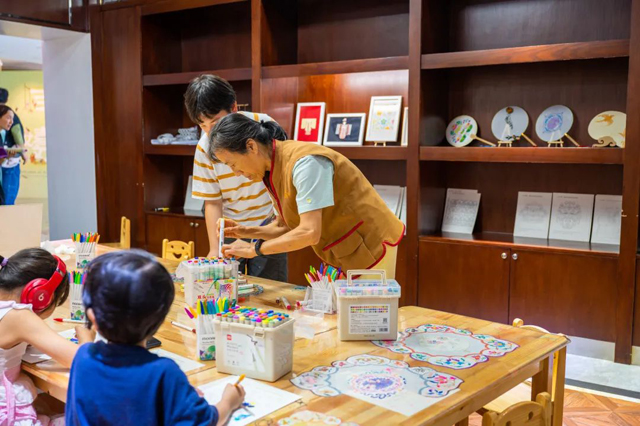 2021年夏天,國絲為低齡觀眾打造的兒童館開放迎客,志愿者在開放第一天就上崗了。伴隨著兒童館不斷發(fā)展,兒童館志愿服務(wù)從最初的展廳管理,發(fā)展到以手工教育為主的綜合性服務(wù)。2022年底,基礎(chǔ)服務(wù)組正式成立。每個周末節(jié)假日,志愿者風(fēng)雨無阻在兒童工坊為觀眾提供隨到隨做的手工體驗。觀眾人流量旺季時,志愿者們還主動“加場”。