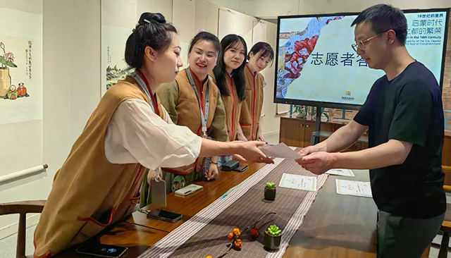 最后,國(guó)絲特邀志愿者參加了一場(chǎng)簡(jiǎn)樸溫馨的“答謝會(huì)”,本次特展策展人張成名副館長(zhǎng)為志愿者頒發(fā)了“榮譽(yù)證書(shū)”,代表博物館感謝他們?cè)?024年絲綢之路周和“18世紀(jì)的里昂”展期間為博物館和觀眾所作出的努力和奉獻(xiàn)。志愿者們也紛紛表達(dá)了在志愿服務(wù)中獲得的體驗(yàn)和感受、對(duì)博物館的喜愛(ài)和對(duì)展覽講解的熱情。溫馨的答謝會(huì)在輕松愉快的交流中結(jié)束,但志愿者的服務(wù)卻并未停止,他們依然活躍在博物館里,在各自服務(wù)的崗位上“發(fā)光發(fā)熱”。