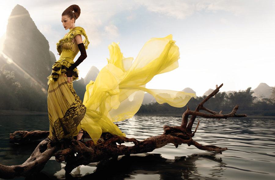 捐贈作品的設(shè)計理念:靈感源于春日清晨波光瀲滟的湖水,其中大禮服為“X”廓型,不對稱單肩設(shè)計強調(diào)層次和褶皺感,以絲綢面料結(jié)合中國現(xiàn)代藝術(shù),在裙擺處加入潑墨效果,營造色彩層次的同時,增添了中國傳統(tǒng)韻味,肩部的水晶裝飾如清晨的湖水,體現(xiàn)嫵媚、奢華的女性形象,垂蕩的結(jié)構(gòu)設(shè)計更為生動地傳達出“碧波”主題的神韻。