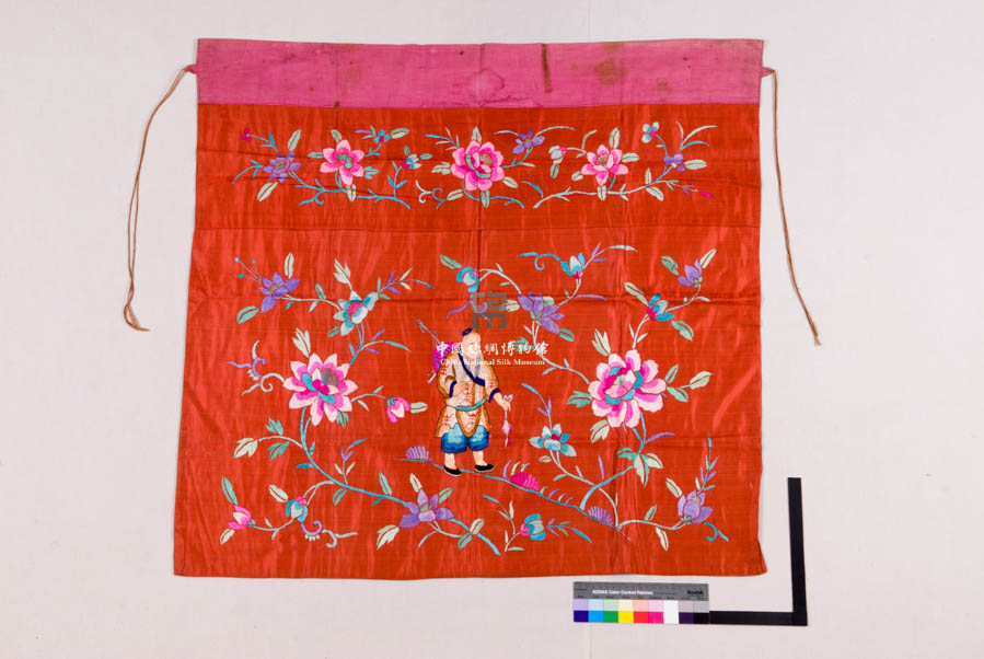 民國(guó)大紅緞地彩繡漁翁牡丹玉蘭桌圍 民國(guó)
