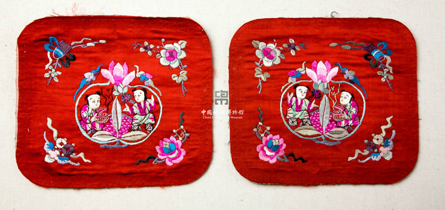 民國(guó)紅緞地彩繡和合二仙枕頂 民國(guó)