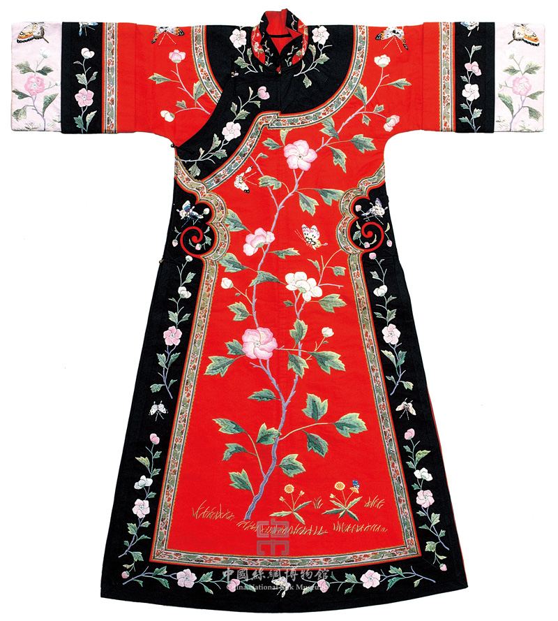 The distinctive costume worn by Manchurian women or female descendants of the Eight Banner Garrisons of the Manchu Empire are generally referred to as Manchurian dress or qi-pao. Prominent on this dress is a full-length flowering hibiscus embroidered on a base of 2:1 twill. There is a slit on each side that goes all the way from the hem to the armpit and finished with a mushroom-shaped ruyi design. Black borders are used for the collar, along the front panel and hemline and cuffs, part of which are also embroidered. An extended section at the cuff reveals a distinctive feature of woman’s costumes of the Qing Dynasty. (XY)