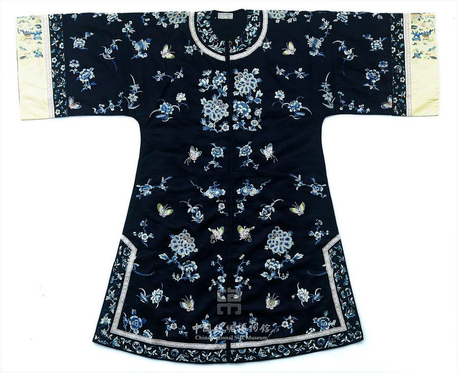 With facing front panels, legged buttons and a circular collar, this woman’s jacket or short gown has embroidered floral patterns along the edges of the collar and front and back hem lines in three blue tones of varying intensity. On a base of black satin, multiple flowers are worked with running, diagonal and looped stitches in light blue, sky blue and indigo blue threads. The flowers include chrysanthemum, orchid, narcissus and peony, which is worked with knot stitch and outlined with gold couching. Butterflies worked with layered stitch in polychrome silk threads are interspersed among the flowers. (XY)