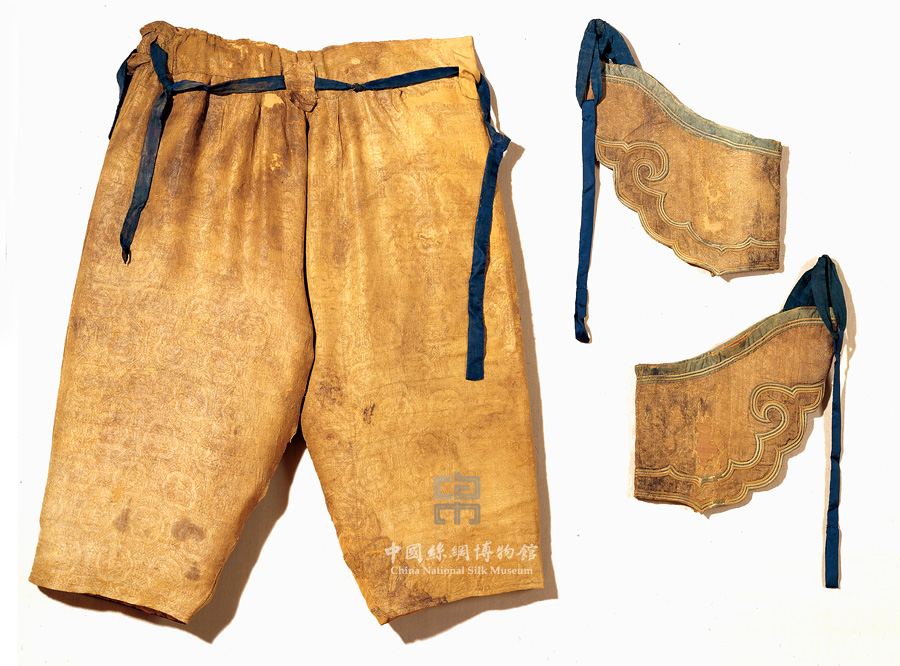 The trousers’ exterior fabric is a polychrome woven silk, the pattern created by the weave is of lobbed, six-sided roundels on a lattice ground. Each roundel encloses a fabulous creature with a long tail, two horns, four feet, sharp beak and spotted pelt, possibly a griffin. The pattern unit is 13cm in warp and 7.2-7.5cm in weft directions. The latticework ground is a well-known pattern documented in a Song dynasty volume on architecture, the Yinzhaofashi by Li jian, and also found on the murals of the Daoist temple, the Yongle Palace, Shanxi province, which date to the Yuan period.