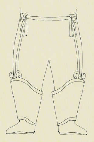 There are four belt loops made of blue silk tabby at the waist and inside the right side of the waist are the remains of a piece of leather, indicating that the entirety of the waist probably once had a leather lining. The belt was made of blue silk, attached to the belt was a silk blue ribbon which was tied with the ribbon from the boot cover.