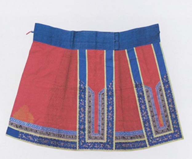 Skirts like this red one are known as horse-face skirts due to the shape of the panels. Each of the two side panels has a rectangular front panel. This particular one in figured silk damask with ball-shaped patterns has a blue waist section of cotton material and embroidered face and bottom sections with bird and flower motifs worked with gold couching on blue ground. The entire skirt is densely pleated. (XY)