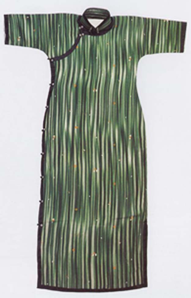 Styled with short sleeves, a stand collar and simple frogs, this qi-pao uses a silk material printed with green stripes in two tones, strewed with little red dots and white small flowers, resulting in a visual color blending sensation. (XY)