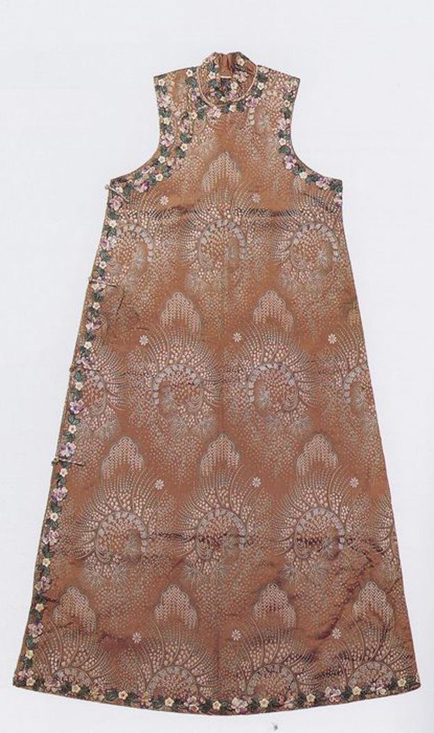 This long-vest in light brown brocade material with floral sprays is similar in style to the gualan vest of late Qing with a stand collar, absent sleeves and an overlapping panel that opens to the right. But here one single border has replaced the heavy and multiple borders.Long-vests such as this one are usually worn over short lined-jackets. (XY)