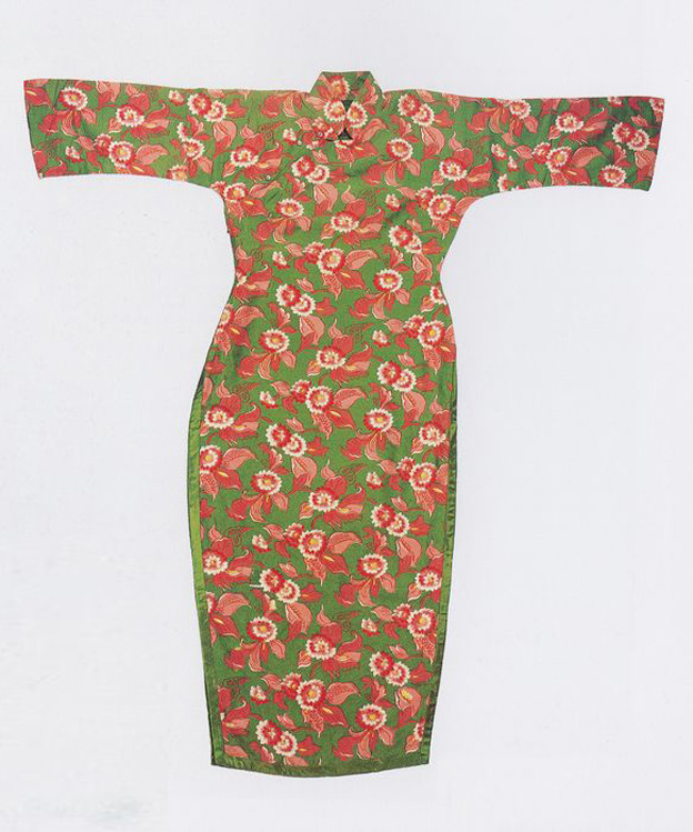 This silk qi-pao reflects the style of the 1940s. Still with a stand collar and a side-opening front panel, it has long sleeves and a gathered waist. The use of snap buttons and a zipper, however,indicates that Western tailoring techniques have been adapted to the making of Chinese style dresses. The material is a satin weave, with large red flowers ona deep green ground. (XY)