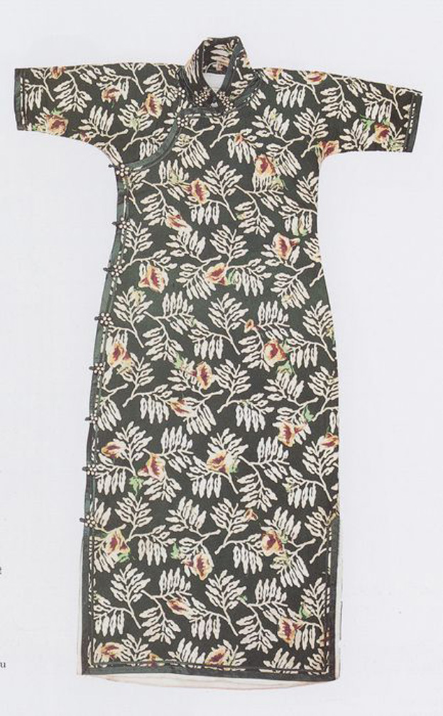 With sprayed leaf patterns on a dark green ground of georgette velvet, this dramatic qijoao has half sleeves and aside-opening front panel. As a good example of the type of high collar qi-pao dresses in vogue during the 1920s and 1930s, this one has three frogs right on the collar up to the chin. A matching green to that in the velvet ground and acorresponding yellow as found in the flowers are used for the frog buttons,creating a superior color harmony. The hems are rolled in green satin, up to 1cm on the outer edge and reduced to 0.3 cm on the inside. (XY)