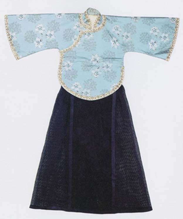 This fitting lined-jacket has a curved hem and sleeves shaped like a trumpet and is bordered with ribbons. The ankle length skirt in black gauze has a self-figured center panel and the rest is thoroughly pleated. Such a combination of a fitting short jacket with a long skirt was regarded as "civilized new outfit" for its adaptation of the stand collar, a tightly fit top, an elevated waist and heavily pleated long skirts from its contemporary European fashion as well as its adherence to the traditional Chinese pairing of a lined-jacketand a skirt. (XY)