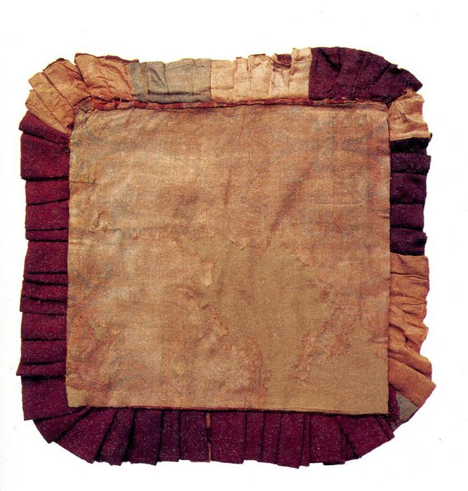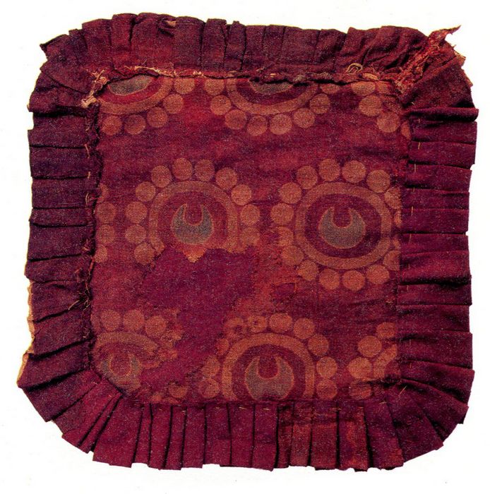 The veil is decorated with colorful damask textiles embroidered with crescent in pearl roundels on the back side, which is a very popular motif in central Asia. Such pattern was later found in Astana of Xinjiang, demonstrating its dissemination along the Silk Road.