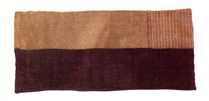 This textile is patched up by three different fragments. Though the color on one of them has faded quite seriously, one can still identify the special curvilinear parapet shape framework.
