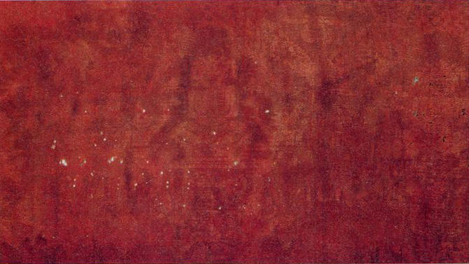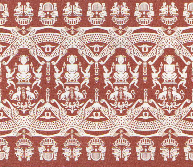 In the middle of the textile sits a deity on the throne with his legs crossed, likely to be Deva from Indian Buddhism. Though it still followed the Chinese tradition to apply dragons and auspicious characters, it reflects close connection with exotic cultures coming through the Silk Road, as the god depicted is from overseas.