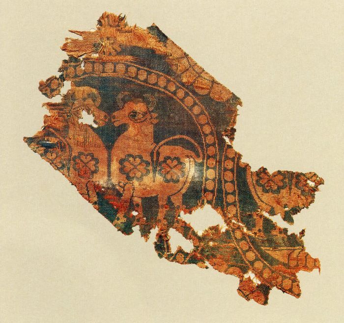 This piece presents classic Tang-style pattern, with pearl roundel as the framework and paired oxen with curving horns and body adornments inside the roundel, which are simple but lively. Unfortunately, due to the poor condition of the textile, we can’t see a complete pearl roundel.