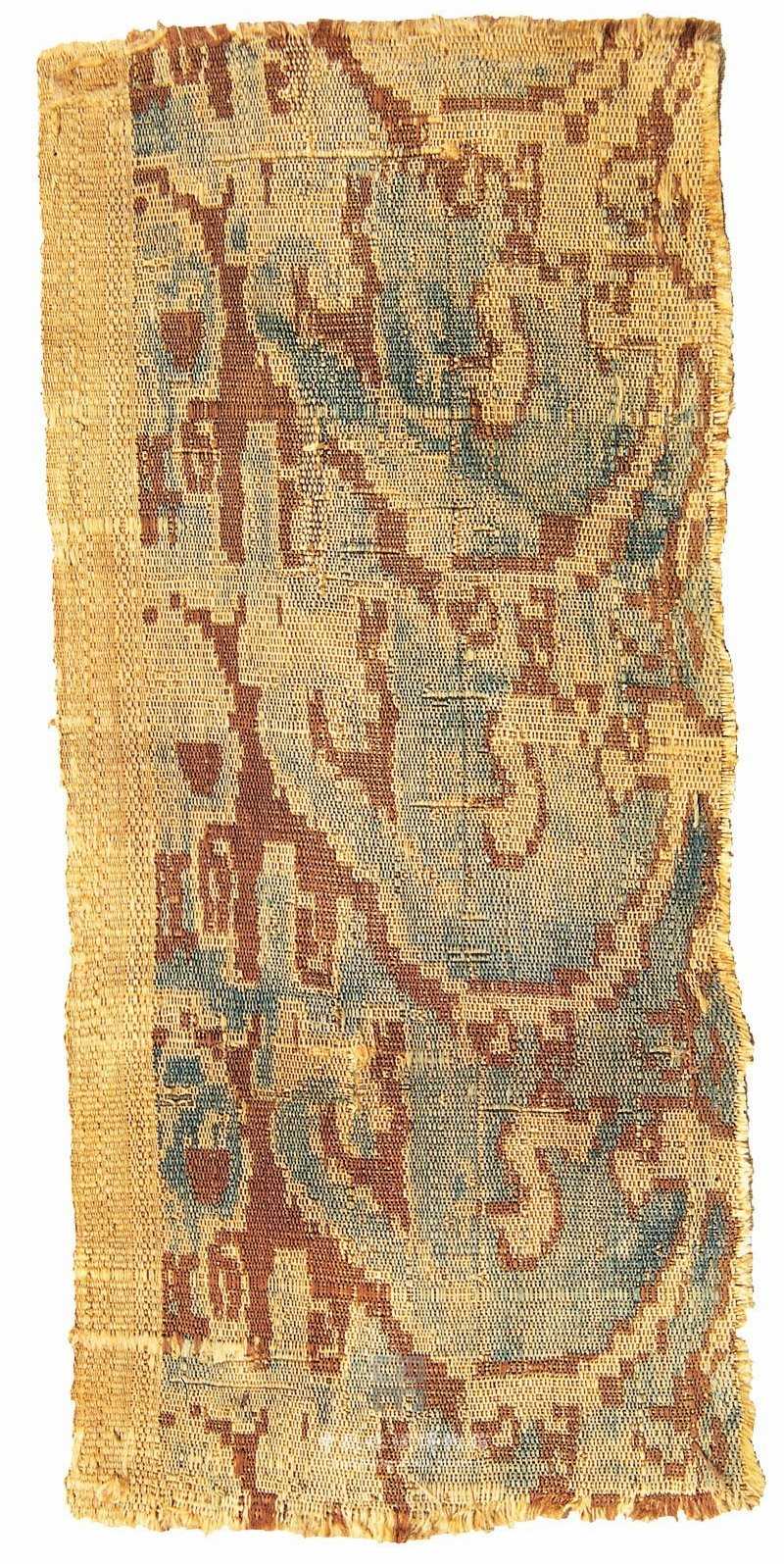 This piece is warp-faced compound tabby. Weft-faced waving clouds are applied as the framework decorated with standing birds.