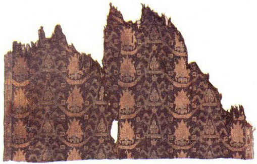 This piece alternates figuring warps in brown, light brown and blue. Cloud pattern is applied as the framework with decoration of two different tree patterns. Similar textiles have been excavated from the Astana cemetery in Turfan of Xinjiang.