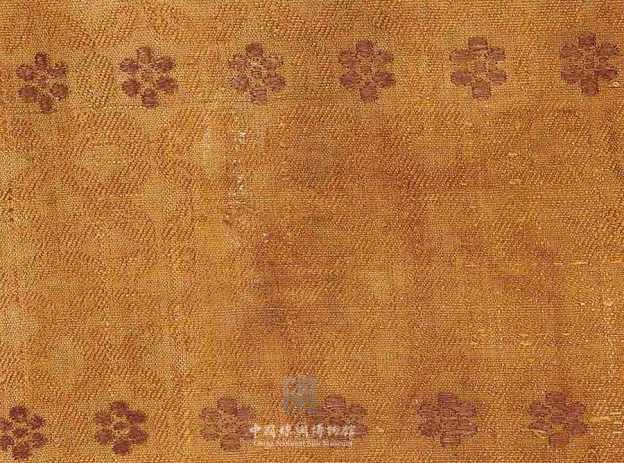 The whole piece consists of yellow warp and weft into a tabby. Light brown wefts were woven into ground, bound in 1/3Z twill, forming a coin pattern as a ground, and brown wefts were floating to represent small flowers. This type of weave was very common during Xixia to Yuan dynasties. (ZF)