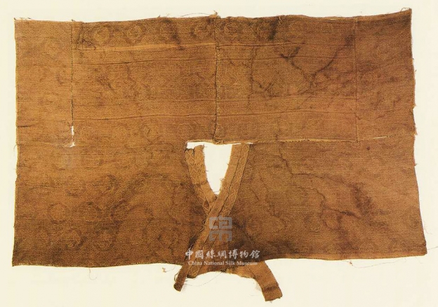 Originally from a female garment with large sleeves, this piece still has the collar shape and shoulder band pattern. Two rows of teardorps, each enclosing alternately rabbit and flower are displayed on a hexagon ground, both of them were popular motifs in Yuan dynasty. (ZF)