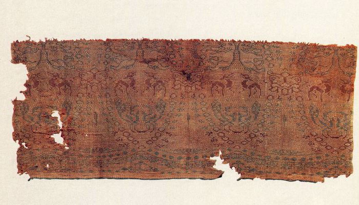 Northern Dynasties L29cm;W12cm(2693) Interlocked pearl roundels and curving clouds are applied as the framework with foreign animals such as elephants, deer and peacocks decorated inside, making the textile highly exotic.