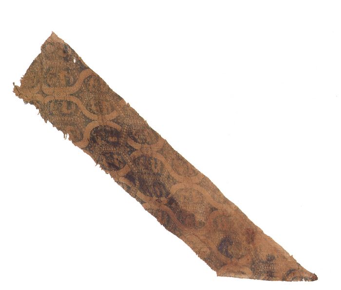 L13cm, W57cmThis is a 1:1 warp-faced compound tabby, arranged in groups of blue and white warp ends. The repeat is 9cm in the warp direction and 13cm in weft. The rare design of this textile is constructed by intersecting frameworks of hexagons and paired S-shaped waves containing a layer of pearls and another layer of rolling clouds. The hexagons are filled with pearls in the center and symmetrical rolling clouds on the edges. Both frameworks have small eight-petalled floral buttons at their joints. There are two groups of animals within the frameworks, one of paired deer and lions and the other of deer and phoenixes. Similar patterns have been found on embroidered textiles of the Northern Wei period from the Mogao Grottos at Dunhuang, where combinations of adeer and a phoenix and one deer and one lion were also identified on a silk panel with dragon, phoenix and tiger motifs discovered in the Library Cave. (XZ)