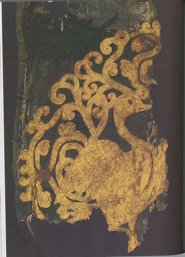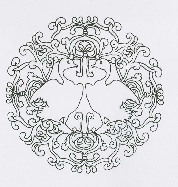 This should be a fragment of a large silk robe, in black doup luo gauze. The design is a pair of confronted geese in a scroll roundel. The roundel consists of four separate scrolls starting from the center in coils that spread and intercross as the branches reach the rim of the roundel. Standing on one leg inside the roundel with a lifted bosom and wings,the geese seem ready to hold a ribbon. Used exclusively as a status symbol since the Tang dynasty for high-ranking officials, this confronted geese roundel constituted to serve this purpose into the Liao dynasty. The deceased, YeluYuzhi from whose tomb this textile was found, was a Minister of the Dongdang Kingdom of Liao dynasty, an official of the first rank and therefore was entitled to wear a costume with such symbols. (XY)