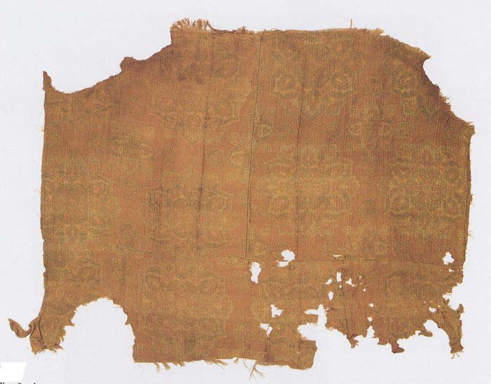 This highly decorative textile features blooming large petalled hexagonal flowers in tender green on a dominant yellow ground. Examples of Tang dynasty floral medallion motifs are abundant among excavated textiles from Dulan, Qinghai and Furfan, Xinjiang, as well as onmurals in Dunhuang. Tang floral medallions fall into four basic types, namely,in forms of petals, in buds, which is a highly decorative type, in profile view and in mini scenes surrounded by birds, bees or butterflies. This textile belongs to the second type, the buds, and is a typical example of the kind of decorative medallions marking the golden years of the Tang dynasty. Most published Tang medallion textiles are in fragments; intact pieces like this one are extremely rare. The weave is a 1:2 weft-faced compound twill, with yellow, white and light green wefts for figure. The repeat is 21.5cm in the warp direction and 22 cm in the weft direction. (XZ)