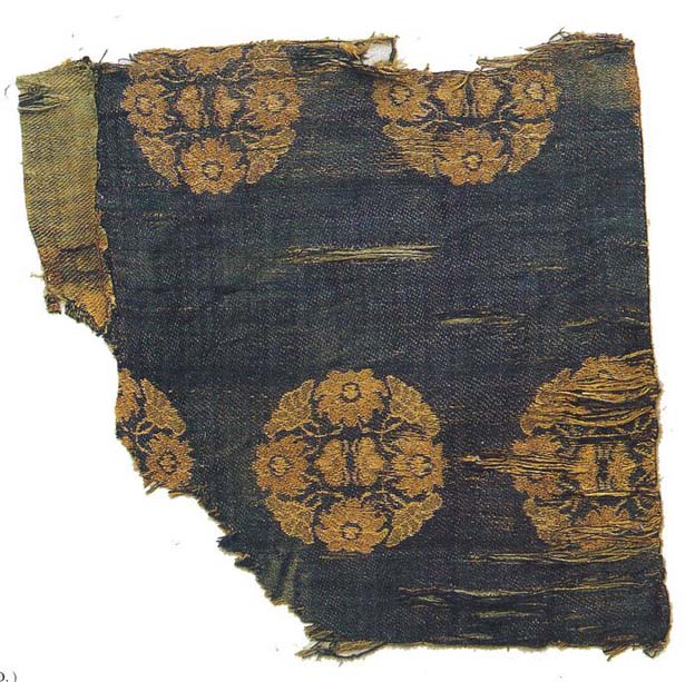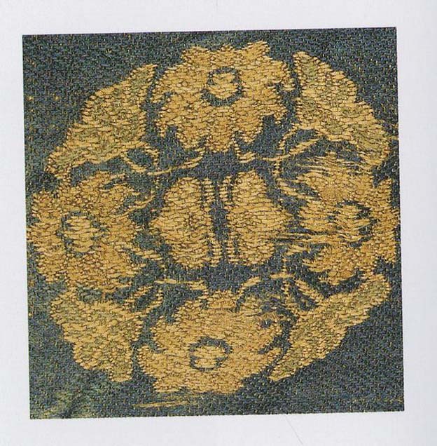 This textile uses small roundels offset to each other in alternating pairs on a plain blue ground. The floral roundels come in two types, each with four flowers stemming from a bee motif at the center. The images are fairly representational. The roundels are 5.4cm in diameter. The introduction of a plain ground as well as the use of alternating offset pairs of motifs was an innovative design approach that developed after the Tang era and was to become a major trend in pattern design in the succeeding Liao and Song dynasties. This weft-faced compound satin weave is a typical Liao samite, with 2 interruptions in a unit of 5 k-ends. The weft threads are in three different colors, a blue weft for ground, a light green serving as a constant figuring weft and a light yellow figuring weft that never surfaces in areas of the blue ground. (XZ)