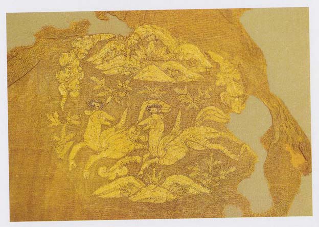 Using a 4 doup end luo gauze for ground,the embroidered elements on this fragment are outlined in couching stitch with a single gold thread and then filled with satin stitch. The roundel shaped design is of a lovely pair of running deer in a forested scene, with trees on top and clouds on the sides. Crowned with the magic herb lingzhi and equipped with wings, one deer is running forward while the other responds by turning itshead. Some flowers and rocks are seen at the bottom in this dynamic scene. Excavated from the tomb of Yelu Yuzhi, this embroidery work reflects the Khitan landscape of deer roaming in autumn forests. (XY)