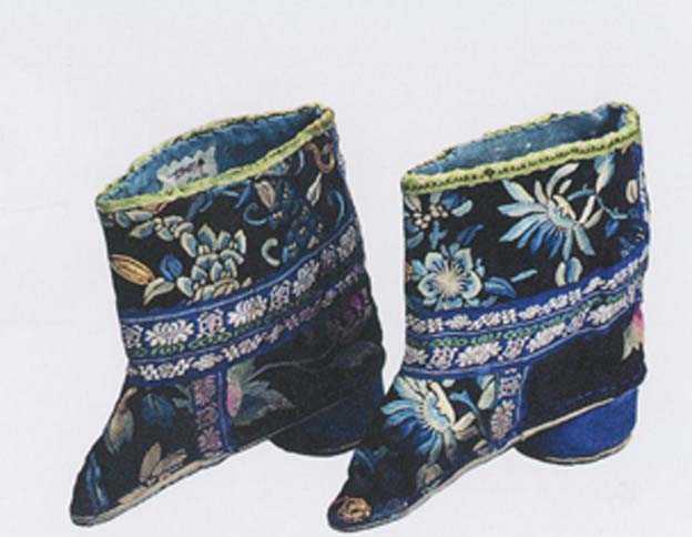 Although these are just shoes,craftsmanship should not be spared. Worked exquisitely on to a black satin base are peach blossoms, chrysanthemum and other flowers in three tones of blue andother polychrome silk threads. The walls of the boot section are separated from that of the shoe and face with embroidered bands of border patterns while the cylindrical heel adds a touch of charm. (XY)