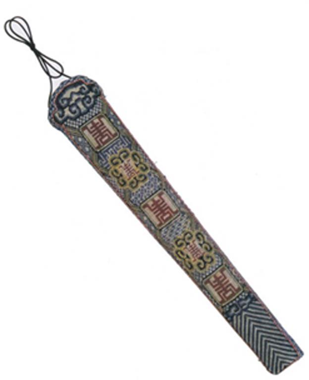 This fan pouch has pattern designs similar to tianhua jin-silk. Worked on a gauze ground in polychrome silk threads in counted stitch are blue geometric patterns serving as a background and the character "longevity" in red thread, which is repeatedly placed in square and octagonal frames that alternate in placement. Down below are wave patterns of the ocean. (XY)