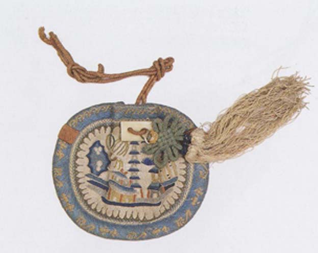 Worked in knot stitch on a white silk basein polychrome silk threads are pagodas and buildings in a landscape. The edges are finished with blue and yellow threads in button hole stitch. Attached to the pouch are a patterned knot with tassels and a string. The composition is full and the colors are in harmony. (XY)