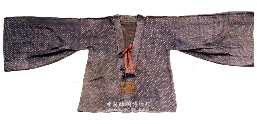 簡介:此件衣服呈褐色,交領(lǐng),袖子為喇叭形的大袖。面料是平紋絹,用絞纈的工藝染出黃色小點(diǎn)紋。絞纈又稱扎染,在北朝開始流行,而保存如此完整的北朝女服尚不多見。
