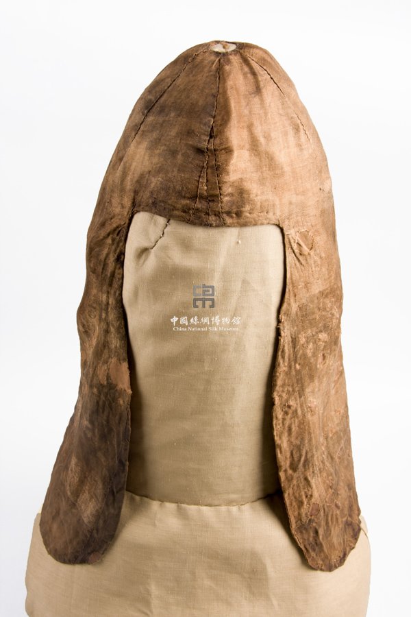 形狀內(nèi)容描述 該風(fēng)帽面料組織為綾織物,斜紋作地,斜紋顯花。形制保存完整,為圓頂長披,頭頂半圓,背面有較長的帽披,上縫有兩條絹帶,用于腦后系縛。面頰兩側(cè)各有一帽披,是當(dāng)時(shí)游牧民族的風(fēng)帽裝束。