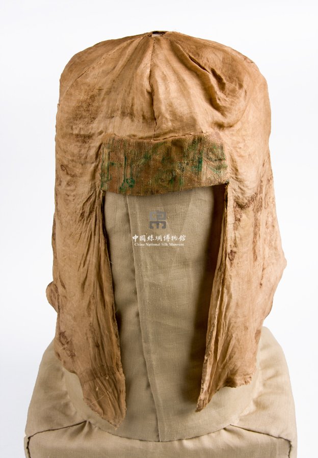 形狀內(nèi)容描述 此帽為唐代北方民族風(fēng)帽。風(fēng)帽的兩側(cè)各有一根上寬下尖的三角形狀平紋絹帶,可將其系于頸處,為掩耳御寒及遮擋風(fēng)沙之用。帽身面料為深褐色平紋絹。帽的前端裝飾的有黃地小花紋錦邊。