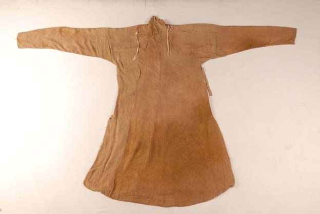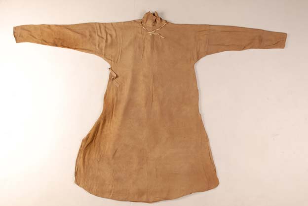 該袍服基本完整,盤領(lǐng)、斜襟,窄袖;織物組織為1/1平紋地上起斜紋花的綺。圖案為大窠聯(lián)珠紋,聯(lián)珠窠內(nèi)填以花卉紋。袍服內(nèi)側(cè)補(bǔ)有一塊龜甲紋的面料。從服裝款式和藝術(shù)特征看,具有隋唐風(fēng)格。