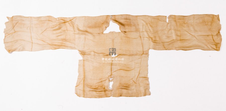 形狀內(nèi)容描述 該單衣片,采用三經(jīng)絞隱花羅面料。三經(jīng)絞隱花羅即地部為一絞二紗組織,花部為一根地經(jīng)與絞經(jīng)成紗組織,另一地經(jīng)以1/1顯隱花。紋樣為小花菱紋。