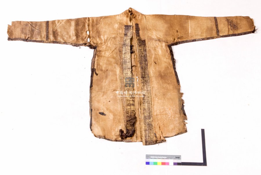 形狀內(nèi)容描述 該長(zhǎng)衫,對(duì)襟長(zhǎng)袖。左右襟緣鑲有印金邊飾。絲織物上用金,原出于對(duì)豪華富貴的追求,印金出現(xiàn)甚早。該衫面料采用折枝花羅。