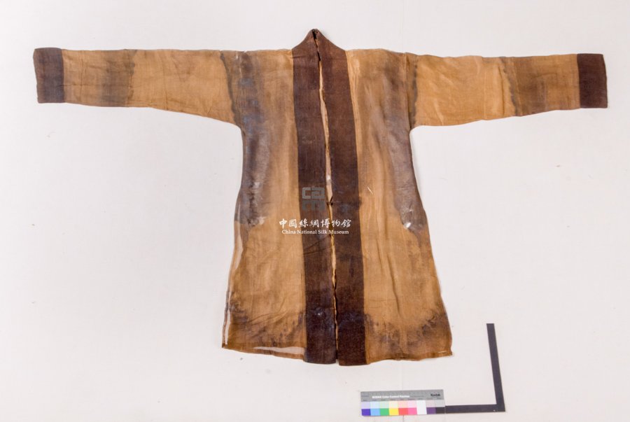形狀內(nèi)容描述 此件衣服對(duì)襟,長(zhǎng)袖,兩腋以下開(kāi)衩,以暗花紗織物為主要面料,其基礎(chǔ)組織為絞紗地上以1/1平紋起花,袖口、領(lǐng)及襟處以褐色絹鑲飾,無(wú)襯里。