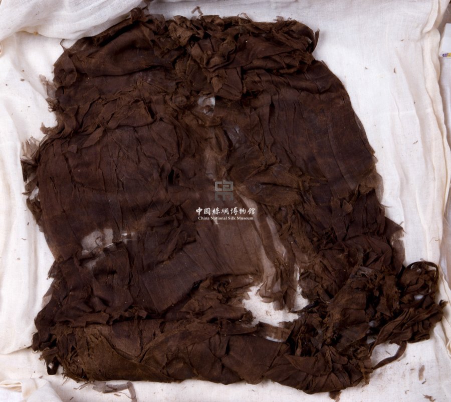形狀內(nèi)容描述 該羅裙極其殘破,款式已無(wú)法分辨,只能分析出其面料為褐色四經(jīng)絞素羅。
