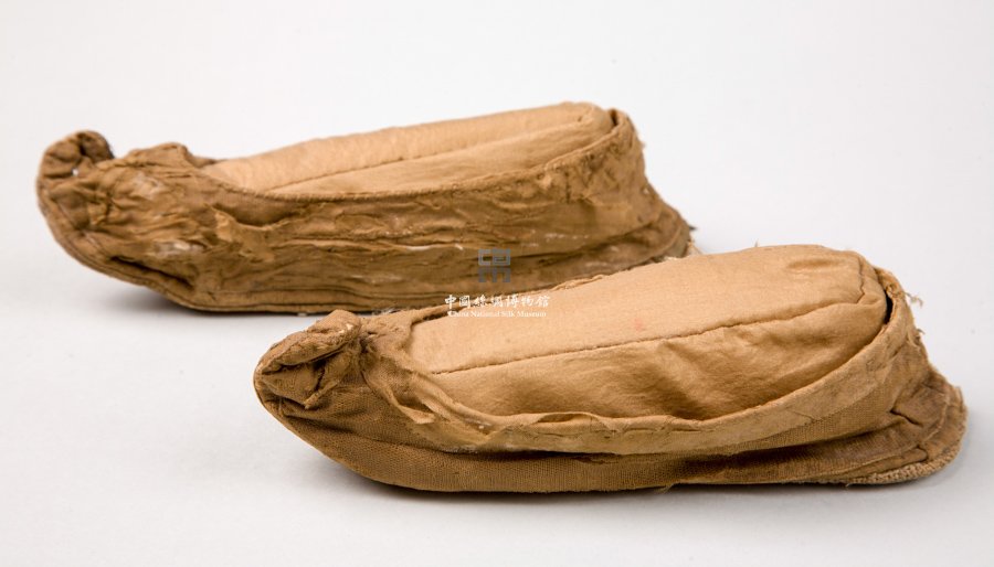 形狀內(nèi)容描述 此鞋尖頭翹首,從鞋形看是一雙用于纏足的小鞋,鞋面面料為黃褐色四經(jīng)絞素羅,鞋里襯絹,衲縫而成。