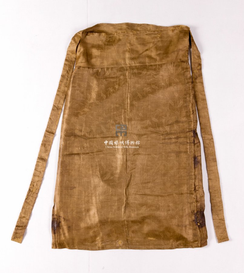 形狀內(nèi)容描述 該裙,腰頭縫以黃色素緞,并釘有腰帶。裙面采用折枝朵花紋紗羅織物。