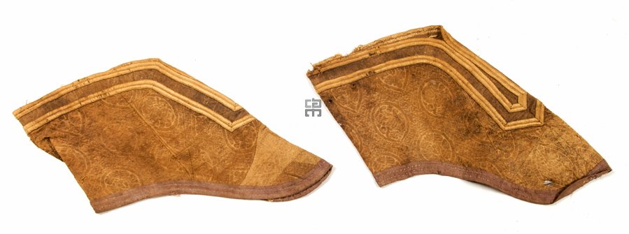 形狀內(nèi)容描述 此靴套共兩只,以織金錦為主要面料,滴珠窠紋樣,其間為兩只相對(duì)而立的翼獸,窠外則點(diǎn)綴有幾何紋樣,有鑲邊。