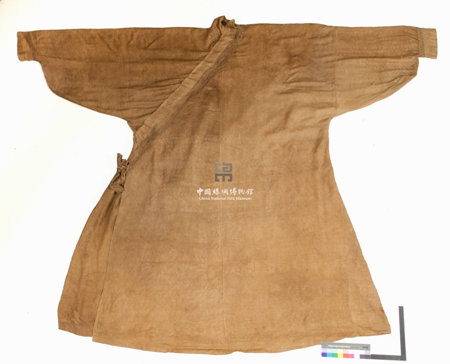 形狀內(nèi)容描述 此袍右衽交領(lǐng),大袖收口,為蒙元時(shí)期女性的正式禮服。主體面料的地組織為2/1S斜紋上起1/2S斜紋暗花,其圖案為成行排列的小朵云紋,每朵云高僅1.3cm。暗花之上應(yīng)該曾有織金圖案,但金箔已脫落,隱約可見圖案為心形窠中的飛鳥紋樣。袍服肩部隱約可見有云肩,應(yīng)該也曾是織金,但其紋樣更加不清。這種設(shè)計(jì)對(duì)當(dāng)時(shí)絲綢之路沿途的服飾及中國明清服飾均產(chǎn)生了極大的影響,明清時(shí)期的纏身式龍袍均來源于此。領(lǐng)袖部分還有兩種不同的納石失織金錦,外側(cè)為菱形四瓣花紋,內(nèi)側(cè)為菱格四點(diǎn)花紋。