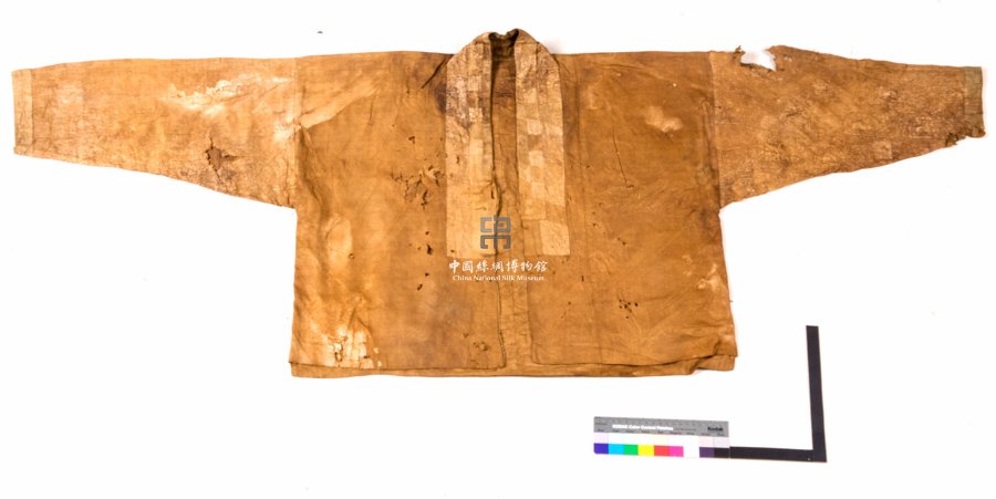 形狀內(nèi)容描述 該件對(duì)襟、長(zhǎng)袖,袖口較窄,與2594原為一套,長(zhǎng)袖穿里,短袖套外。 以花卉紋綾為面料印金,印金圖案的主體是水波地上麒麟紋(又似鹿紋),而在領(lǐng)口處印有方搭紋,十分華麗,極為罕見。