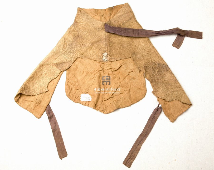 形狀內容描述 姑姑冠是元代蒙古族婦女最有特色的冠帽,是蒙古貴族婦女身份和社會地位的標志。此帽為姑姑冠的冠披,戴于展筒之下端。面料為蒙元時期流行的納石失織金錦,以特結經(jīng)固結金線緯線,以Y形鎖甲為地,以桃形窠內填鳥紋為主紋。鳥紋三個一組,中間為雙頭鳥。雙頭鳥具有中亞藝術風格。帽額綴有呈方勝形的珍珠飾品,頭頂及左右兩側各縫的一根羅帶, 以固定冠帽。