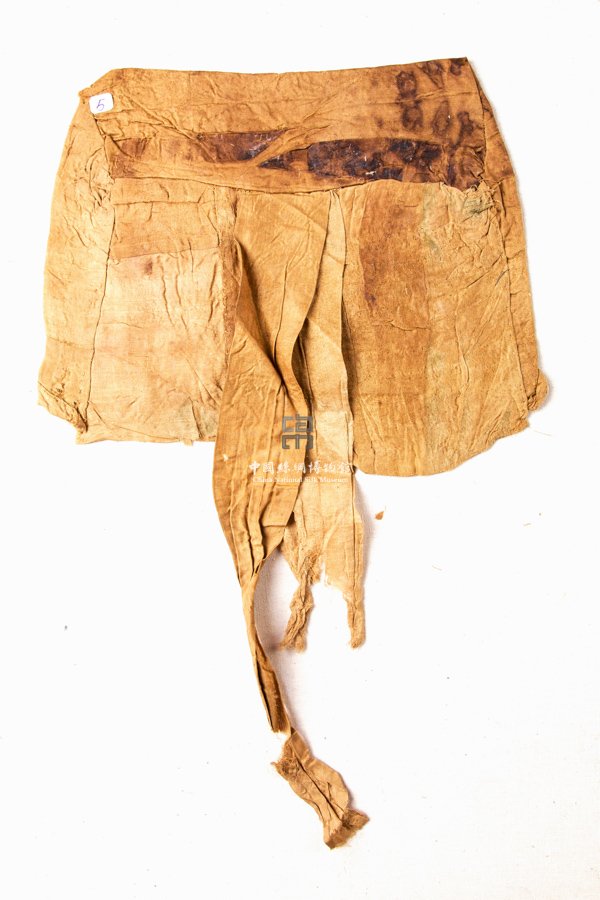 形狀內(nèi)容描述 此為一頂絹帽,現(xiàn)呈黃色,頂端略有污跡,帽下方縫有兩根絹制系帶,現(xiàn)已殘斷,可能為元代漢人所服用。